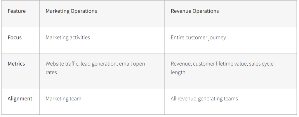 Revenue Operations is a broader function that aligns sales, marketing, and customer success teams to optimize the entire customer journey and drive revenue. It involves breaking down silos, improving data quality, and implementing technology solutions to enhance efficiency and effectiveness across the entire revenue organization.
